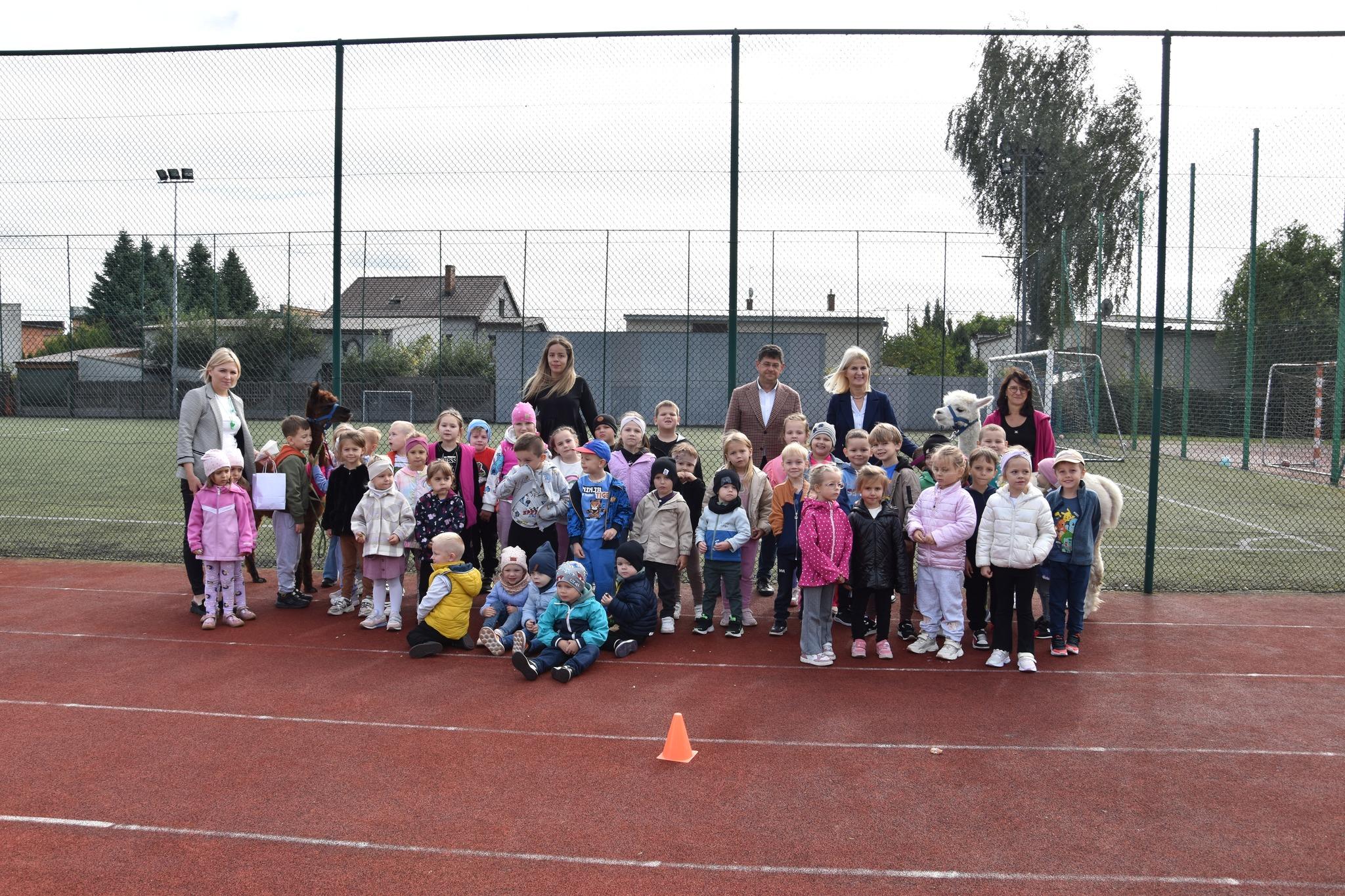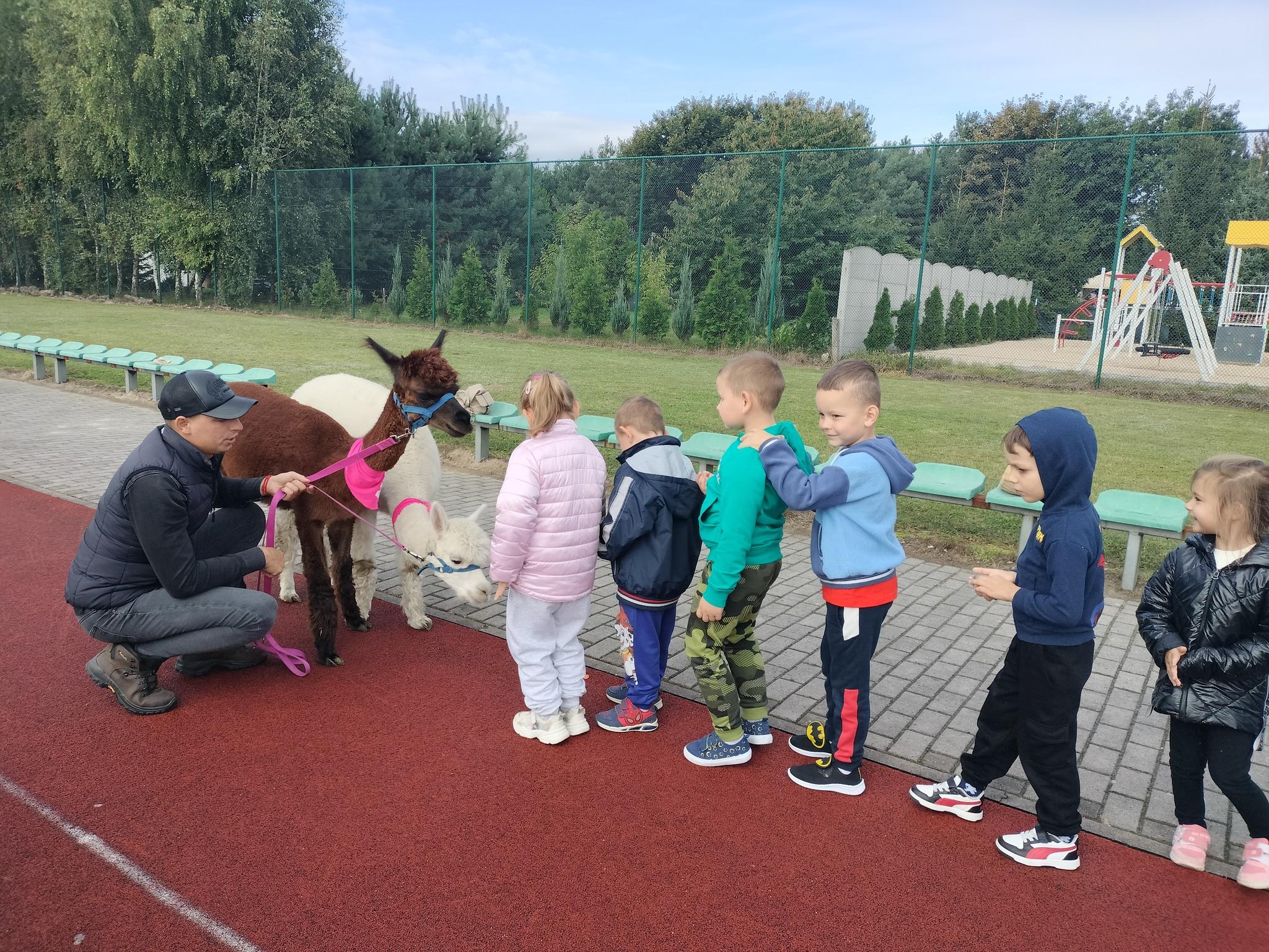 Wielką niespodzianką okazała się wizyta alpak, które każdy przedszkolak mógł pogłaskać, nakarmić, pójść na spacer i zrobić pamiątkowe zdjęcie. Nie zabrakło również zabaw ruchowych i tanecznych na świeżym powietrzu, malowania twarzy i łakoci, które wręczył dzieciom Pan Rober Łoza – Wójt Gminy. To był dzień pełen radości, zabawy i niezapomnianych wrażeń.
