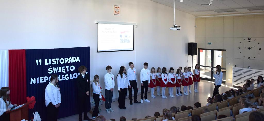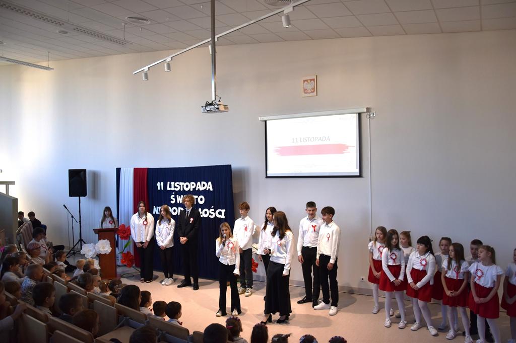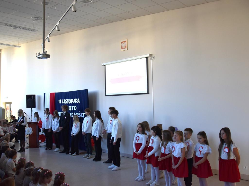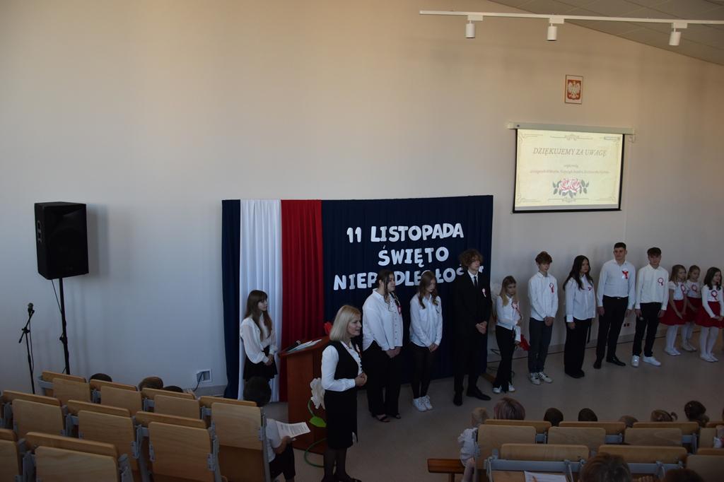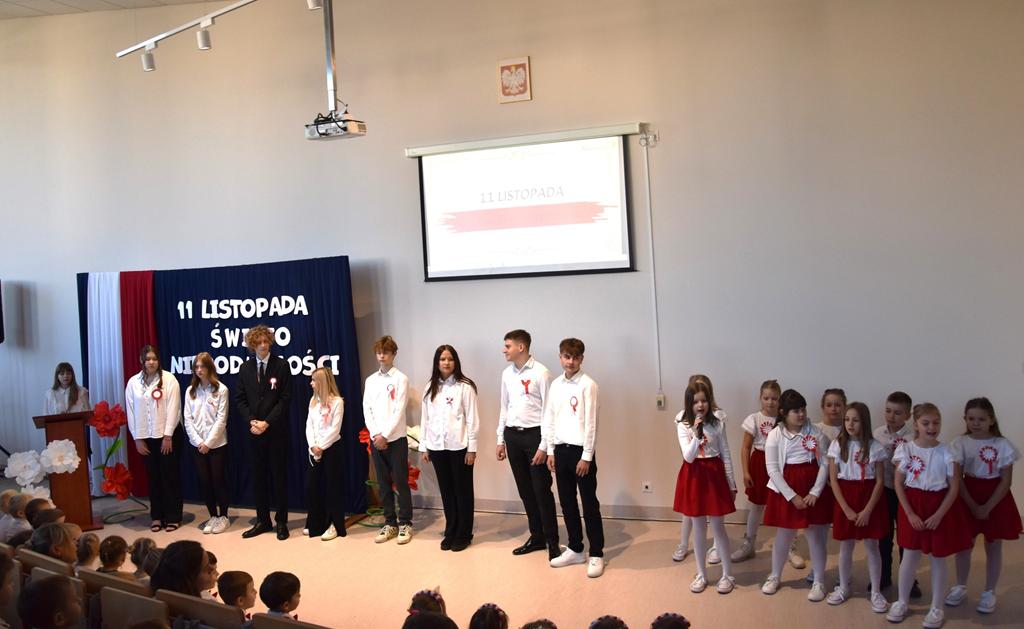 Dnia 7 listopada 2025r. odbyła się w naszej szkole uroczysta akademia z okazji Święta Niepodległości. Uczniowie klas III i VIII przedstawili program artystyczny, na który złożyły się wiersze i pieśni patriotyczne przypominające kluczowe wydarzenia z historii naszego kraju. Na zakończenie wszyscy wspólnie odśpiewali hymn narodowy. Program przygotowały: p. Ewa Kaźmierczak i p. Agata Ratajczyk.